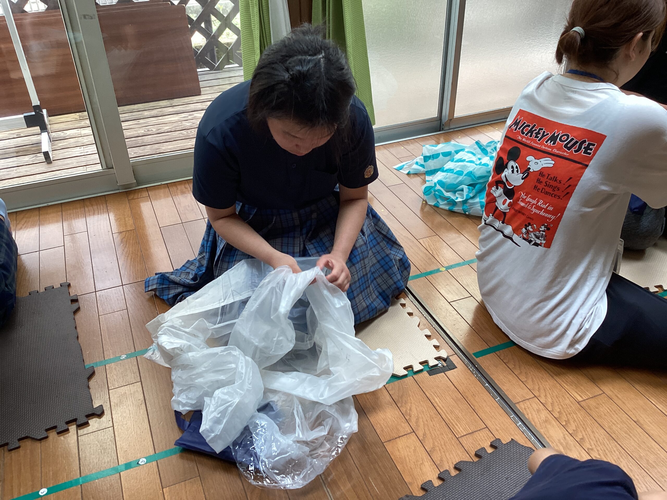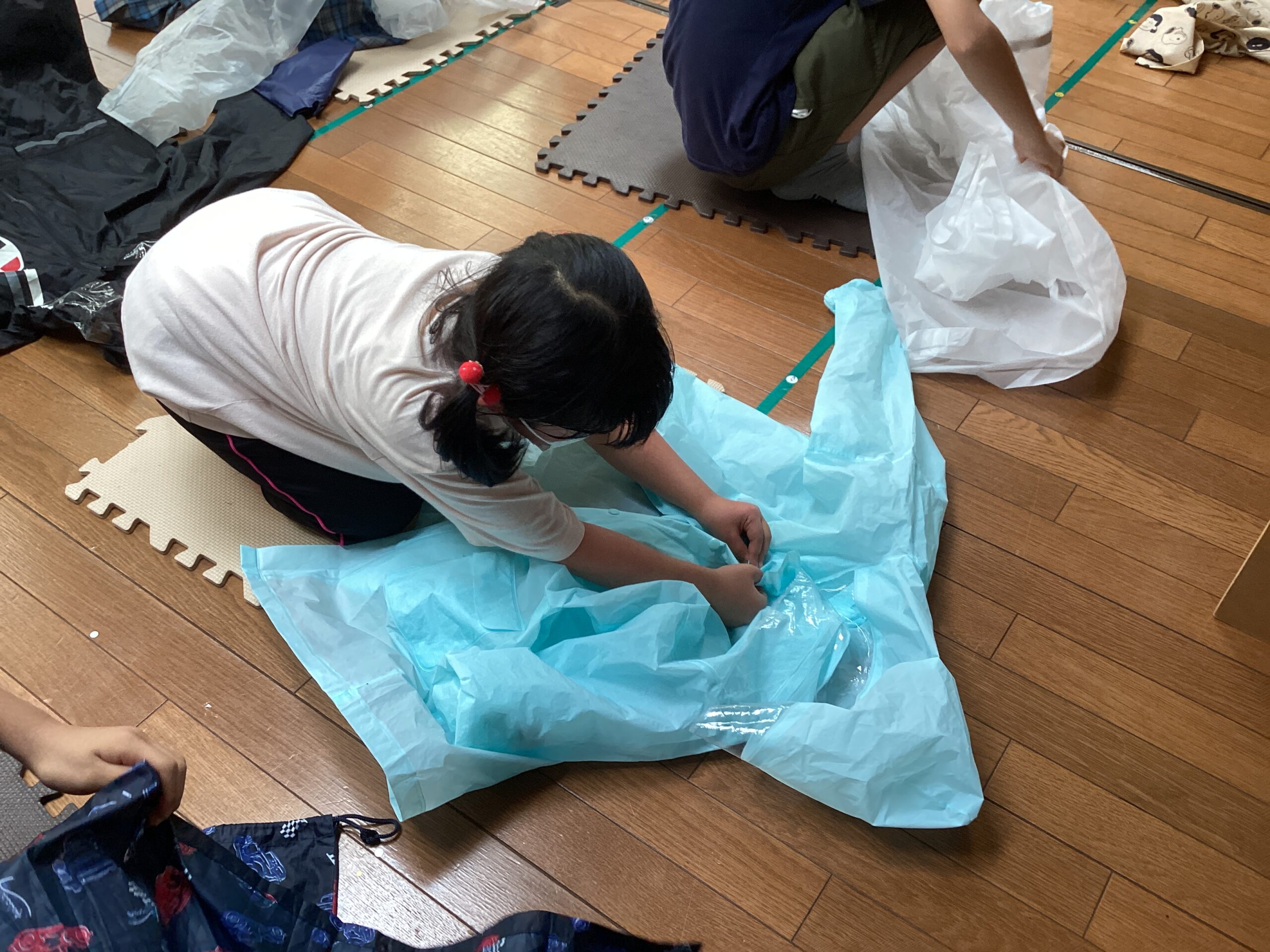 外に出た際にどのように雨を凌ぐのか?カッパの畳み方まで教えることで、綺麗に畳んで収納することまで行います。