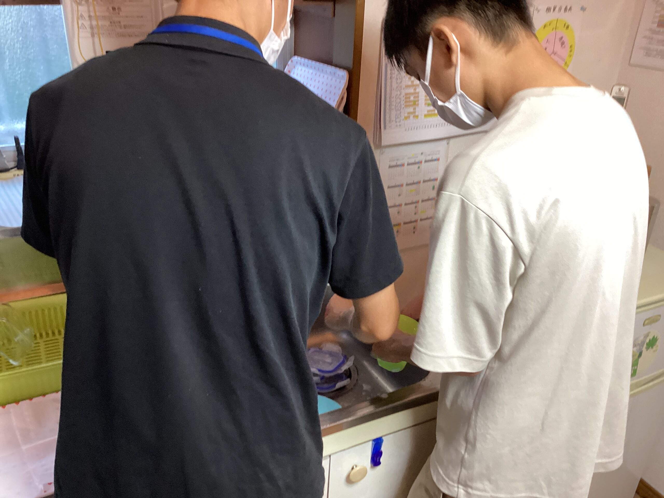 道具を使って掃除をする。掃除の通りを体験します。その後綺麗に掃除をすることを指導して行きます。