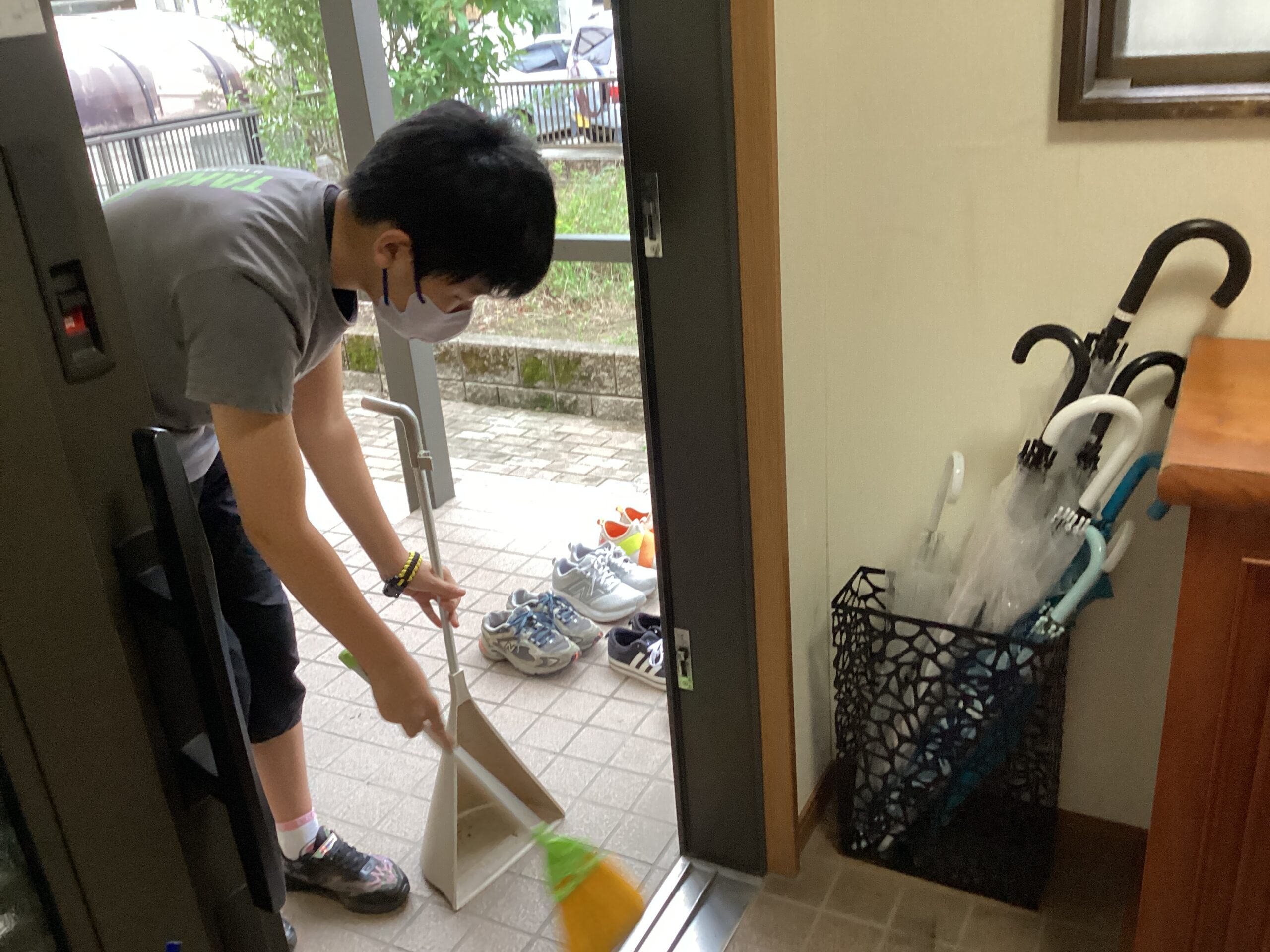 道具を使って掃除をする。掃除の通りを体験します。その後綺麗に掃除をすることを指導して行きます。